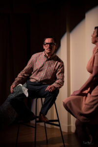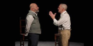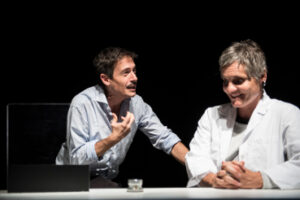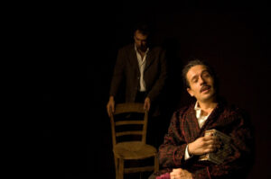 Il testo è diviso in quadri ed è scritto per 4 personaggi. La scelta di farlo con due, non è stata assolutamente semplice. Ho avuto la fortuna di lavorare con due attori bravissimi: Paolo Panaro e Roberto Petruzzelli.