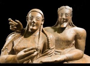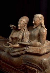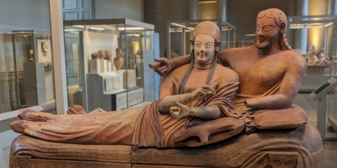 Nel silenzio di una sala del Louvre, due sposi giacciono distesi da secoli, immersi in un banchetto eterno. Lo sposo, sorridente, è raffigurato mentre è sdraiato su un triclinio: il gomito sinistro appoggiato su otri di vino, simbolo del consumo durante i conviti, e le gambe avvolte da un telo leggero.