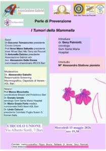 Fare prevenzione dunque, può salvare la vita. Per questo, l’Associazione Gabriel, odv per l’umanizzazione delle cure in oncologia e l’Inner Wheel Bari Alto Terre dei Peuceti, accogliendo una proposta di Geny Palmiotti, oncologo e fondatore dell’umanizzazione in Puglia, hanno organizzato tre appuntamenti dedicati alla prevenzione.