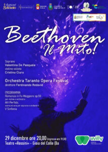 Il 29 dicembre alle h. 20:00 appuntamento presso il Teatro “Rossini” di Gioia del Colle (Ba), in collaborazione con Lions Club Gioia del Colle – Putignano, mentre il 30 dicembre alle ore 20:00 lo spettacolo sarà replicato nell’Auditorium “I. Montanelli” di Turi (Ba), con una produzione che svela le molte sfaccettature del genio di beethoven, capace di unire energia e introspezione, forza creativa e profondità lirica.