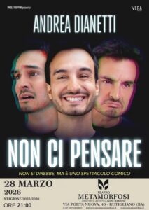 Dopo il debutto alla Sala Umberto di Roma e l’avvio di una tournée che sta toccando le principali città italiane, lo spettacolo arriva in Puglia per una serata che si preannuncia all’insegna del divertimento e della condivisione, Andrea Dianetti, artista poliedrico e amatissimo dal pubblico televisivo e social per la sua ironia brillante e la sua straordinaria versatilità, porta in scena “Non ci pensare”.