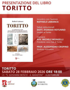 Una ricerca circa le origini del paese, dellolo studio della morfologia e delle architetture rurali, eseguito con approccio appassionato e rigore scientifico come solo il nostro autore e’ capace. L’evento è sponsorizzato dall’amministrazione comunale e dal Lions Club Toritto.