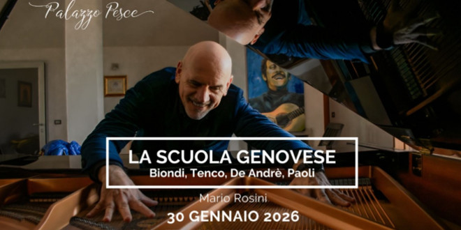 Venerdì 30 genanio 2026, h. 21.00 Palazzo Pesce presenta La scuola Genovese Biondi, Tenco, De Andrè, Paoli con Mario Rosini alla voce e pianoforte. La serata sarà dedicata al mondo della musica cantautorale genovese, da Biondi a Tenco, da De André a Paoli. Un approfondimento musicale riletto dal gusto interpretativo di Rosini in versione piano e voce. Venerdì …