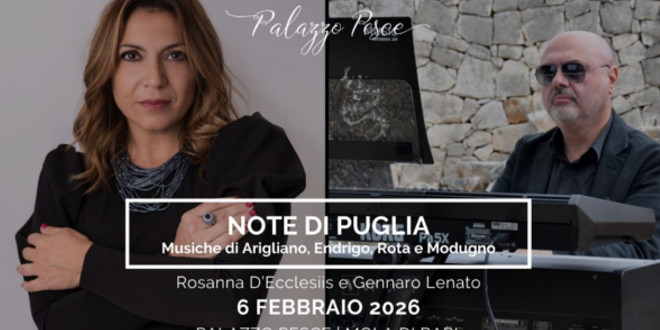 Venerdì 6 febbraio 2026, h. 21:00 Palazzo Pesce presenta Note di Puglia Suoni, voci e storie dal tacco d’Italia. Musiche di Nicola Arigliano, Sergio Endrigo, Nino Rota e Domenico Modugno con Rosanna D’Ecclesiis voce e Gennaro Lenato pianoforte. “Note di Puglia” è un viaggio musicale attraverso le voci, i suoni e le emozioni di una terra che …