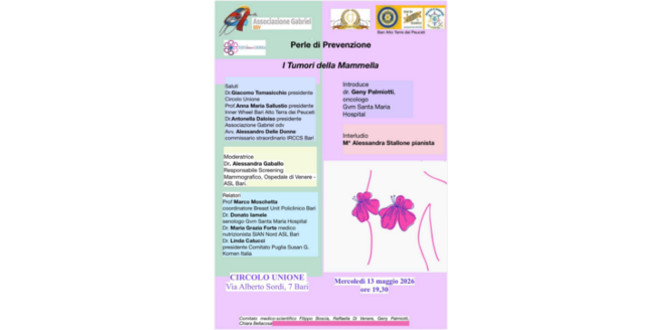 Le Perle di Prevenzione di Geny Palmiotti Dedicate ai tumori del colon retto, ginecologici e della mammella organizzate dalla Associazione Gabriel e da Inner Wheel Terre dei Peuceti. Terzo appuntamento 13 maggio, h. 19:30 Circolo Unione - Bari La prevenzione dei tumori del colon-retto, ginecologici e del seno si basa su due pilastri  fondamentali: stili …