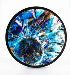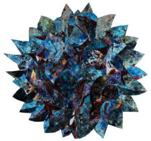 Hai diverse opere dalle forme radiali, quasi esplosive, e una tavolozza dominata da blu e grigi argentei e anche da contrastanti aranci e rossi. Ti piace la forza delle forme e dei contrasti cromatici?