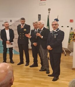 Da sinistra: Presentatore Sandro Scarafino – Tenente di Vascello Gennaro Moccia Comandante Ufficio Circondariale Marittimo di Monopoli – Consigliere Nazionale A.N.M.I Contrammiraglio Marco Luigi Cisternino, Delegato regionale Puglia settentrionale – Basilicata A.N.M.I Gesumino Laghezza – Presidente A.N.M.I gruppo di Monopoli Luogotenente Cav. Martino Tropiano.