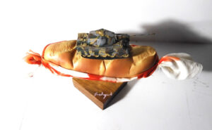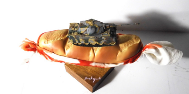 Al centro di quest’allestimento tanta ordinarietà drammatica: un pane monumentale, trafitto da catene e martoriato da proiettili immaginari, sul quale poggia un carro armato che ne appesantisce la levità simbolica.