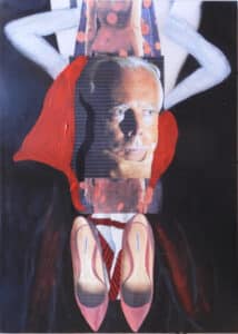 Intorno a lui, un abito rosso da donna, fluido e vibrante, che si prolunga nel collage fino a culminare in un paio di scarpe rosse. Non è solo un tributo alla sua arte sartoriale, ma un gesto simbolico potente.