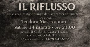 “Dalle reali testimonianze dei lavoratori dei mattatoi. Maria, una lavoratrice sulla cinquantina. Maria ha ritrovato sul luogo di lavoro, un mattatoio pugliese, quell’ambiente familiare di complicità, affetto e goliardia che le è sempre mancato in famiglia. Poco a poco, durante l’intervista sul suo lavoro però, le parole della lavoratrice sveleranno …