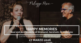 Venerdì 27 marzo 2026, h. 21:00 Palazzo Pesce presenta Happy Memories Soul and Jazz Musiche di Streisand, Gershwin, Di Modugno con Luciana Negroponte voce e Vito di Modugno pianoforte. Un programma che ripercorre le canzoni che riportano a ricordi felici. Vito di Modugno e Luciana Negroponte propongono un repertorio di songs che …