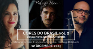 Venerdì 12 dicembre 2025, h. 21:00 Sala Etrusca di Palazzo Pesce Mola di Bari presenta “Cores do Brasil vol.2 Bossa Nova Samba Originals” insieme a Stefania Arcieri voce, composizioni, Francesco Schepisi pianoforte e Pierluigi Balducci basso elettrico. Un concerto interamente dedicato al mondo musicale brasiliano, attraverso percorsi armonici intensi, accompagnati da ritmi vivaci e coinvolgenti. …